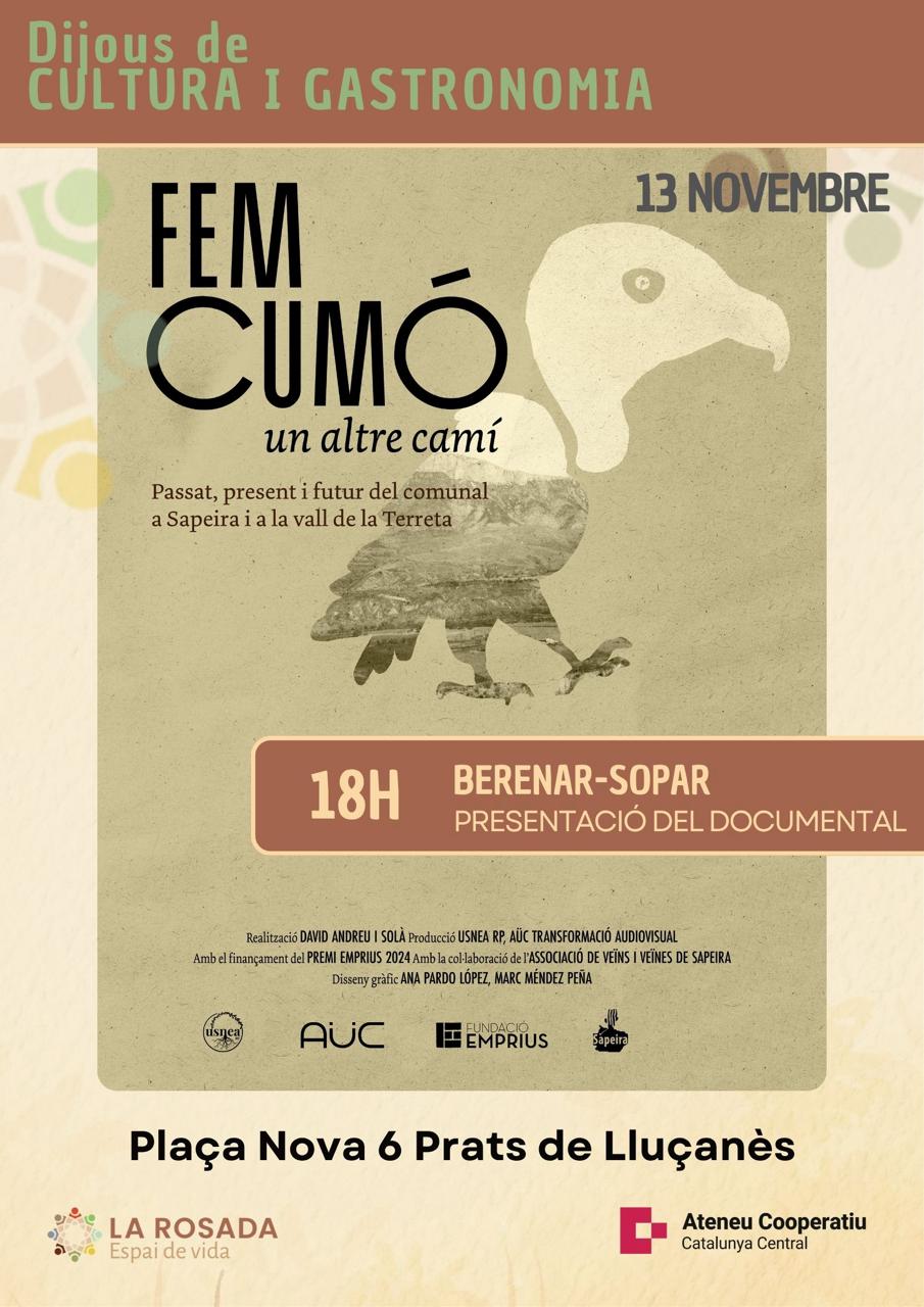 El dijous 13 de novembre es projectarà el documental “Fem cumó, un altre camí” a Prats de Lluçanès, a les 18h a La Rosada (Plaça Nova, 6). Tota la informació aquí.