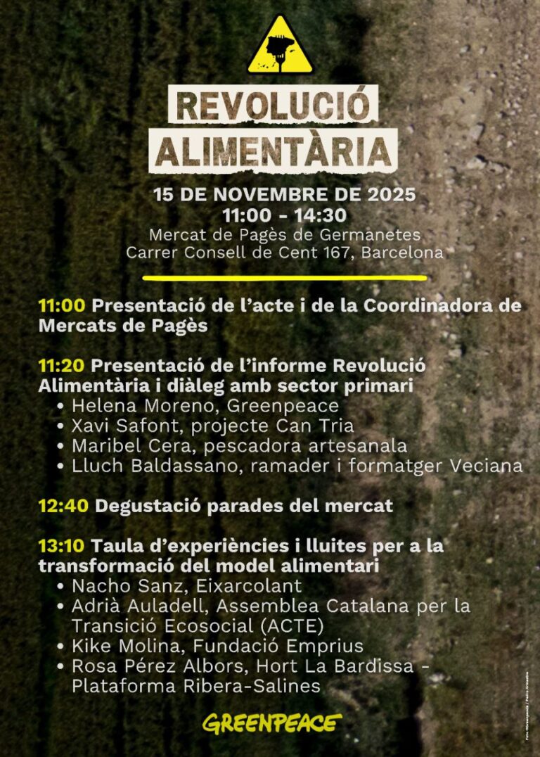 El dissabte 15 de novembre participem a la jornada “Revolució alimentària”, organitzada per Greenpeace Catalunya a Barcelona (Esquerra de l’Eixample). Hi participen també persones del sector primari, d’Eixarcolant, de l’acTe, de la Coordinadora de Mercats de Pagès… Tota la informació al cartell.