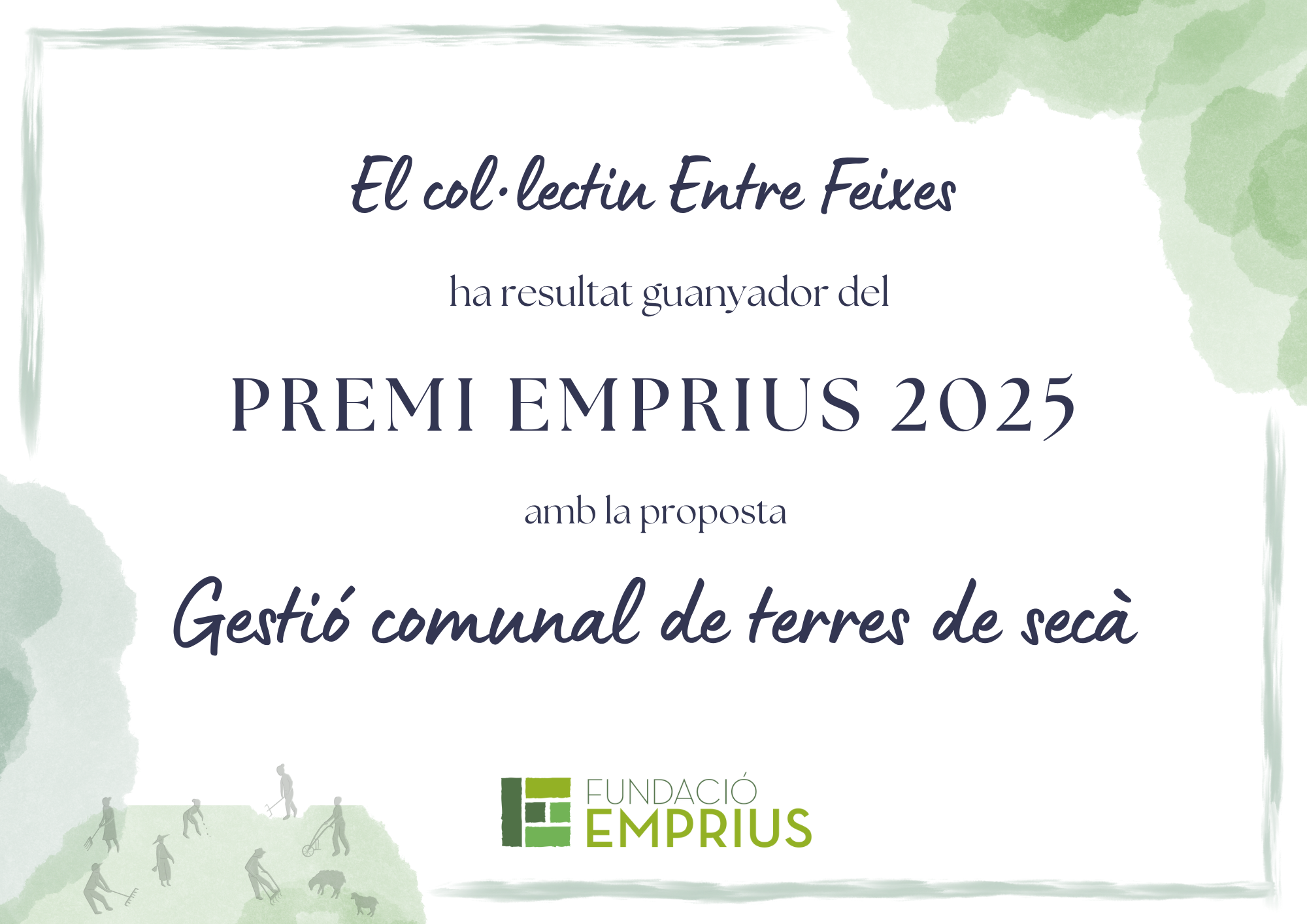 La proposta guanyadora del Premi Emprius 2025 ha estat “Gestió comunal de terres de secà”, presentada per Entre Feixes, col·lectiu autogestionat de recuperació de cultius de secà de Manresa i rodalies. La proposta es pot descarregar en PDF aquí.